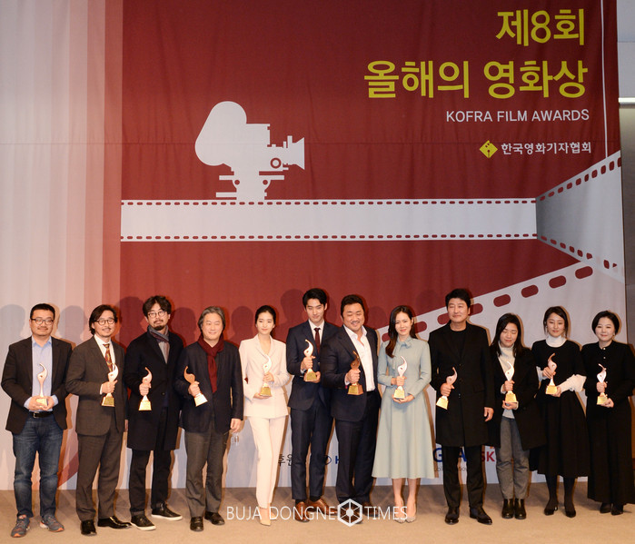 18일 오후 서울 중구 프레스센터 국제회의장에서 열린 제8회 올해의 영화상에서 수상자들이 기념촬영하고 있다. 왼쪽부터 연상호 감독, 김호성 폭스인터내셔널 프로덕션 코리아 대표, 나홍진 감독, 박찬욱 감독, 배우 김태리, 정가람, 마동석, 손예진, 송강호, 윤가은 감독, 박미애 이데일리 기자, 양지혜 NEW 팀장. 2017.01.18.