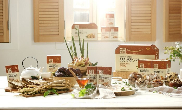 ‘하루기초 365 생강진액’은 생강의 주산지로 유명한 경북 안동에서 수매한 햇생강을 진하게 달여낸 제품이다. 영지버섯, 도라지, 갈근, 대추, 당귀 등 11가지 한약재로 영양을 더하고 귀한 밤꿀의 깊은 단맛까지 담아냈다.