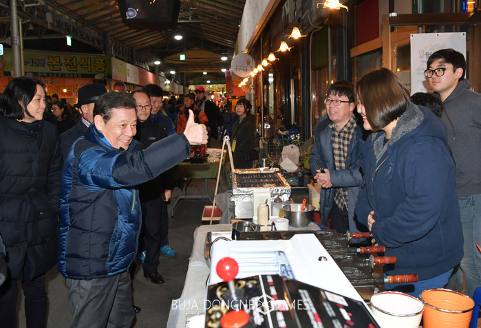 | △윤장현 광주광역시장이 18일 저녁 올해 첫 개장한 대인예술야시장을 찾아 상가를 둘러보고 상인들을 격려하고 있다 |