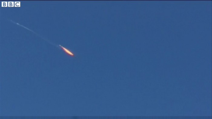 | △ 24일(현재시간) 터키 공군에 의해 격추된 러시아 전투기 SU-24 기체가 하강하고 있다. <사진출처=BBC 홈페이지 캡쳐> |