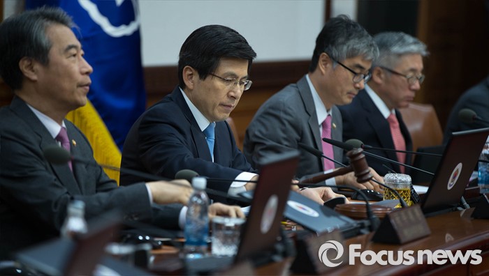 (서울=포커스뉴스) 3일 오전 서울 종로구 세종대로 정부서울청사에서 열린 국무회의에서 황교안 국무총리가 의사봉을 두드리고 있다.
