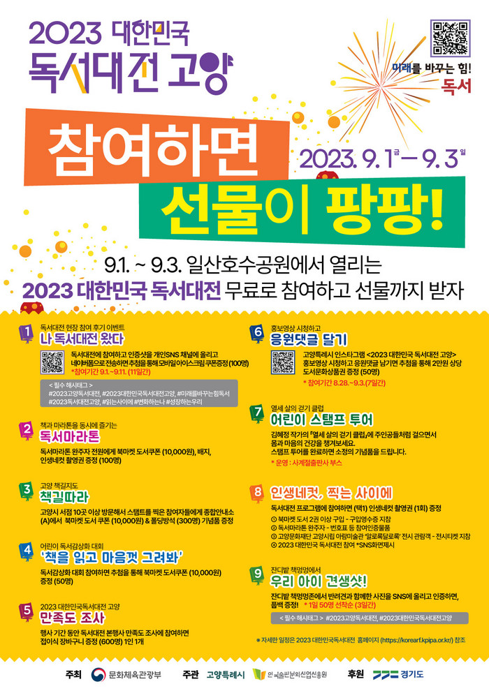 9월 1일부터 11일까지 ‘나 독서대전 왔다’ 이벤트가 진행된다. 시민이 독서대전에 참여하고 인증 사진을 필수 해시태그(#2023고양독서대전, #2023대한민국독서대전고양, #미래를바꾸는힘독서 #2023독서대전고양, #읽는사이에 #변화하는나 #성장하는우리)와 함께 개인 소셜미디어(SNS) 채널에 올린 뒤 네이버폼으로 제출하면 추첨을 통해 100명에게 아이스크림 쿠폰을 증정한다.