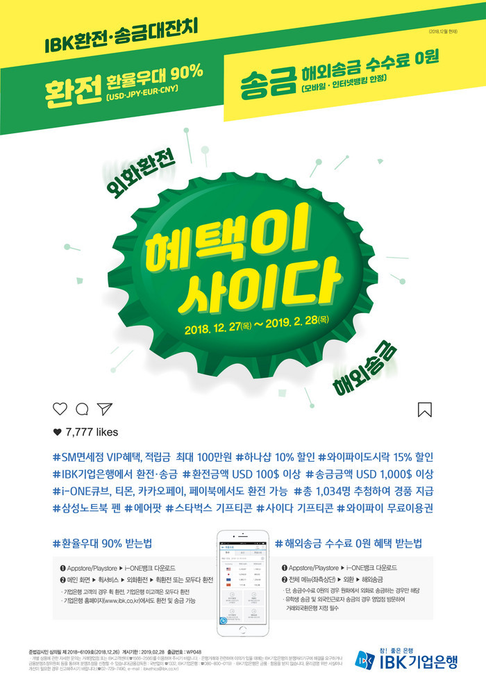 [부자동네타임즈 이현재 기자]IBK 기업은행(은행장 김도진)은 겨울철 해외여행 시즌을 맞아 내년 2월말까지 개인고객을 대상으로 다양한 경품혜택을 제공하는 ‘IBK환전・송금 대잔치’를 실시한다고 28일 밝혔다.
