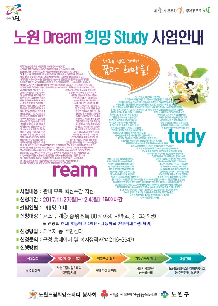 ‘희망 스터디’사업은 2013년 노원드림 희망스터디 학원봉사회와 협약을 맺고 저소득층 학생들이 학원수업을 무료로 수강할 수 있는 기회를 제공하는 것이다. 구는 오는 27일부터 다음달 4일까지 각 동 주민센터에서 신규 대상자 40명에 대한 수강신청을 받으며 지원대상은 중위소득 80%이하의 저소득 초·중·고등학생이고, 초등학생의 경우에는 4학년부터 신청 가능하다.