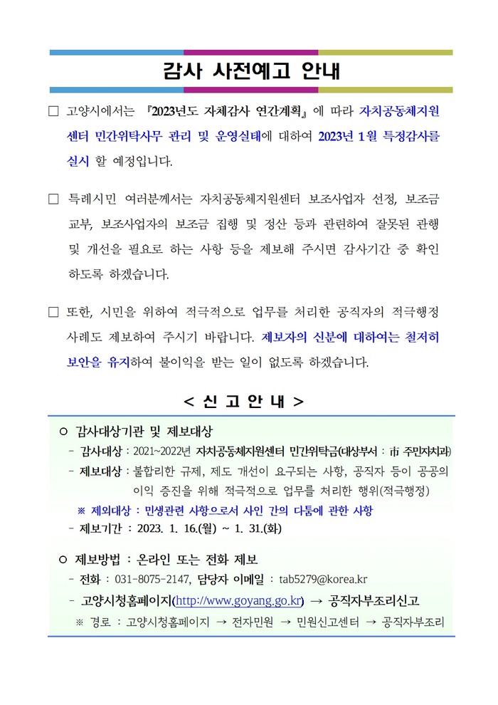 또한 고양시는 1월 18일부터 1월 31일까지‘시민과 함께하는 공개 감사’를 실시, 거짓이나 부정한 방법으로 지방보조금을 교부받거나 직원의 비리, 위법·부당행위 등에 대한 내부직원 및 시민들의 제보를 받고 있다. 단, 사인 간의 다툼에 관한 사항 또는 사생활을 침해할 우려가 있는 사항 등은 제외된다.