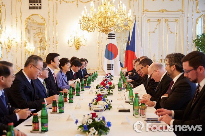 | △ 체코를 방문 중인 박근혜 대통령이 3일(현지시간) 오후 한‧비세그라드 그룹(V4) 정상회의를 개최한 뒤 경제와 정치 공조를 강화하는 공동성명문을 채택했다. 사진은 2일(현지시간) 밀로시 제만 체코 대통령과 정상회담을 진행 중인 박 대통령. <사진출처=청와대> |