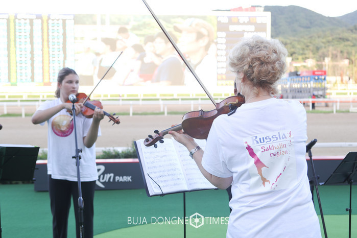 [부자동네타임즈 이채봉 기자]한국마사회(회장 이양호) 렛츠런파크 서울 관람대 앞 시상대에서 8월 12일(토) 제9경주 직후(17:40 출발), 11명의 '러시아 사할린 주립 청소년오케스트라'의 공연이 개최돼 눈길을 끌었다.