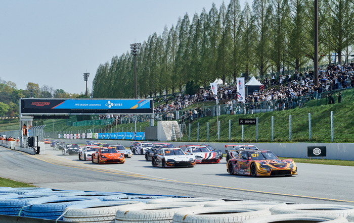 [사진 설명] 2022 CJ대한통운 슈퍼레이스 챔피언십 개막전에서 레이스카들이 관중들의 환호 속에 힘차게 출발하고 있다.