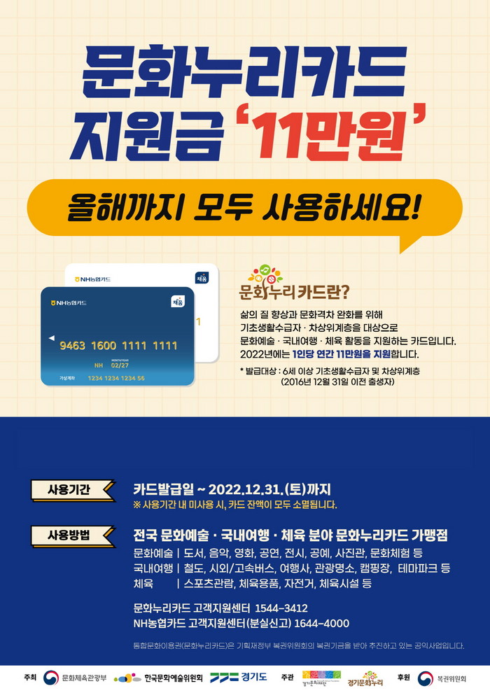 시 관계자는 “2022년 문화누리카드 지원금액이 총 11만원으로 증가한 만큼, 지원금이 소멸되지 않도록 꼭 사용하여 주시길 바란다.”라고 밝혔다.