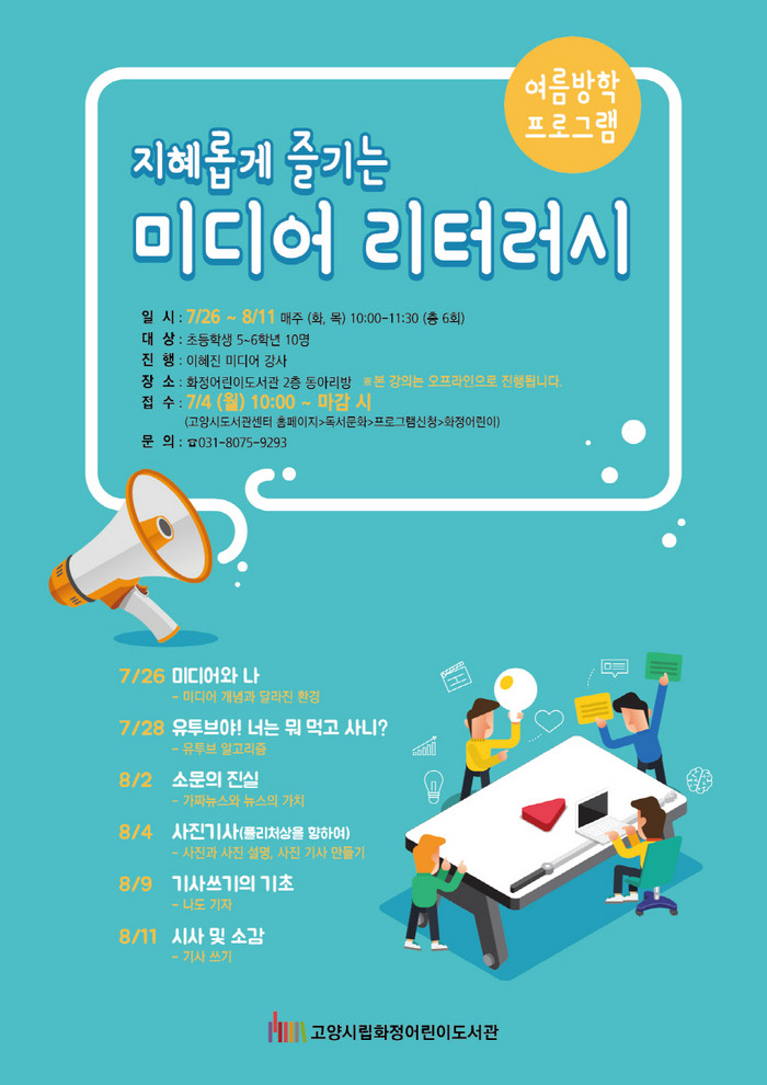 접수는 7월 4일(월) 오전 10시부터 고양시도서관센터 홈페이지에서 선착순으로 모집하며 기타 자세한 사항은 화정어린이도서관으로 문의하면 된다.