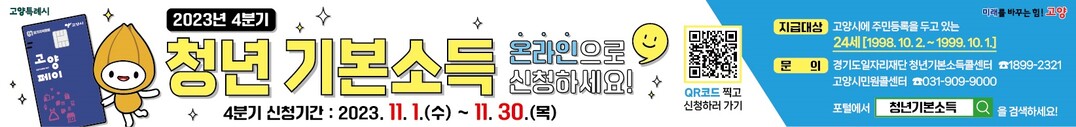 청년기본소득은 신청일 기준 고양시에 주민등록을 두고 있는 청년 중 경기도 거주기간이 최근 3년 이상 계속(또는 합산 10년 이상)인 24세 청년에게 분기별 25만원(최대 4분기 지원)을 카드형 고양시 지역화폐(고양페이)로 지급하는 청년복지 정책이다.