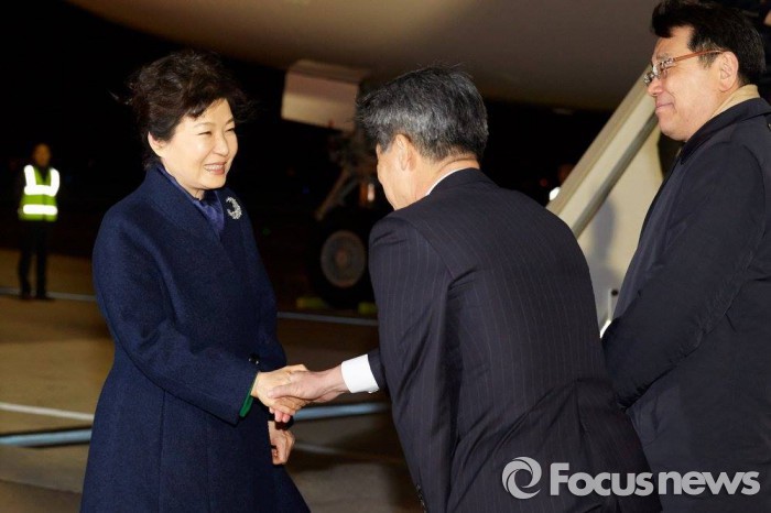 | △ 프랑스 파리를 방문 중인 박근혜 대통령은 30일 오전(현지시간) 열린 제21차 유엔 기후변화협약 당사국 총회(COP21) 개막식 격인 기후변화정상회의(Leader‘s Event)에 참석해 "新기후체제를 반드시 출범시켜야 한다"고 말했다. 사진은 지난달 29일 프랑스 파리 오를리(Orly) 국제공항에 도착해 영접나온 윤종원 주오이시디대사와 악수하는 박근혜 대통령 모습. <사진출처=청와대> |