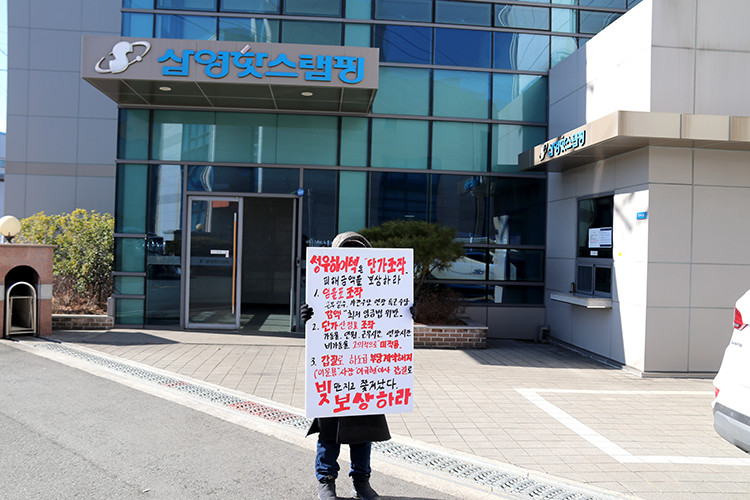 의(성우하이텍의 경주 핫스템핑 공장 사내 하청업체의 전 대표 정수연씨가 경주에 위치한 성우하이텍 산하 핫스템핑 공장 앞에서 1인 시위를 하고 있다)