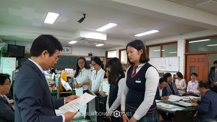 | △광주동신여자고등학교 교직원 제자사랑장학회가 15일 스승의 날을 맞이해 가정형편이 어려운 제자들에게 장학금을 지급했다 |