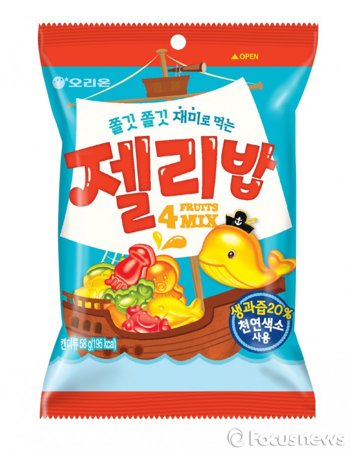젤리밥은 과자 '고래밥'의 바다 동물 캐릭터로 만든 제품이다. △사과 △오렌지 △딸기 △파인애플 등 4가지 과일 맛의 젤리다.