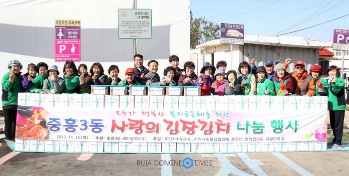 지난 15일과 16일 중흥3동 새마을부녀회와 문흥1동 지역사회보장협의체에서 각각 배추 250포기, 무 200포기를 김장해 어려운 이웃에 전달했으며, 건국동 자생단체협의회는 20일부터 23일까지 관내 독지가로부터 기부 받은 배추 1,000포기를 직접 수확해 김장한 김치를 어려운 이웃에 전달한다.