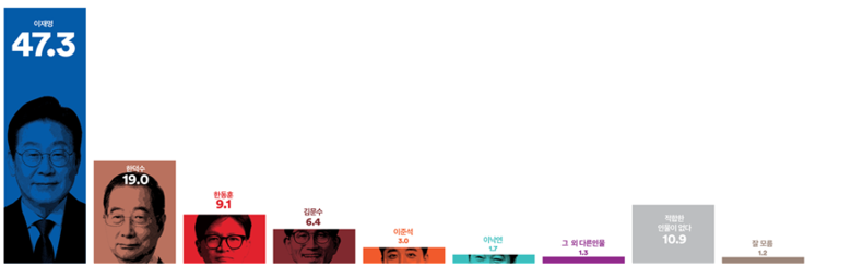 지역별로는 대구·경북을 제외한 모든 권역에서 ‘이재명’이 압도적인 선두를 차지했다. 대구·경북에서는 ‘이재명’(32.4%)과 ‘한덕수’(29.3%)는 3.1%p 격차로 오차범위 내 접전 양상을 보이며 팽팽하게 맞섰다.