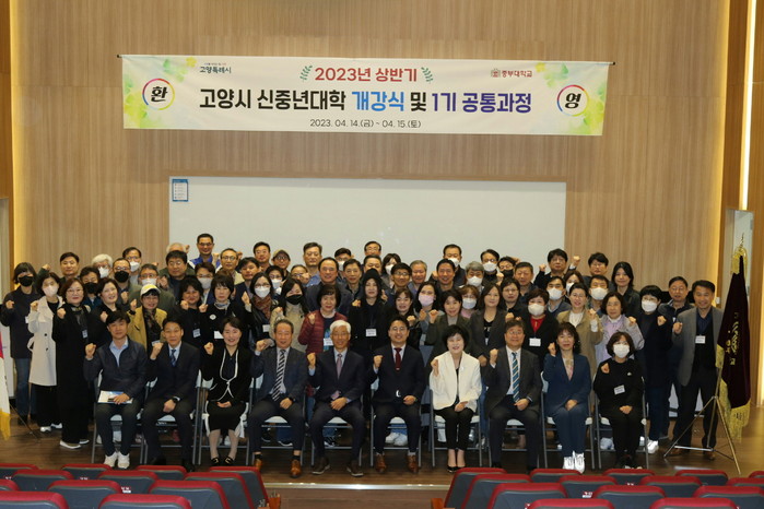 [부자동네타임즈 김인수기자] 50세에서 65세 미만의 고양시민 100명이 참석한 가운데 4월 14일(금) 중부대학교에서 2023년 고양시 신중년대학 상반기 개강식을 진행했다.