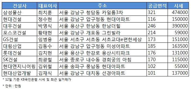 12일 포커스뉴스가 시공능력 상위 10개 건설사 사장 10명이 사는 주택을 분석한 결과, 평균 매매가격은 18억2550만원, 평균 공급면적은 180㎡(구 55평)으로 집계됐다.