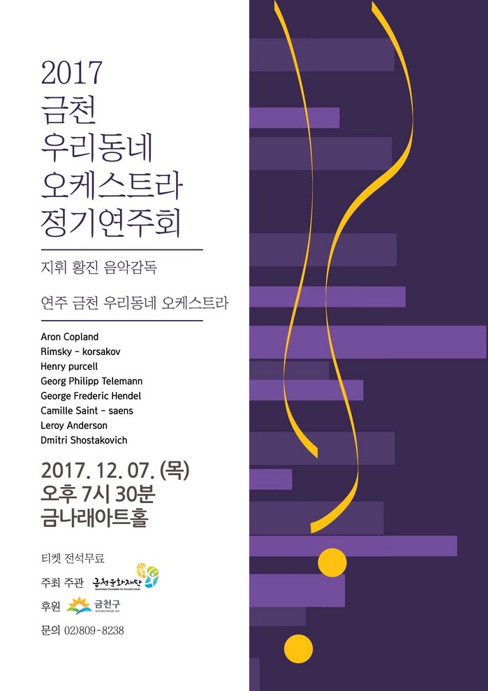 [부자동네타임즈 이병도 기자]금천문화재단(대표이사 정재왈)이 ‘2017 금천 우리동네 오케스트라(음악감독 황진)’ 정기연주회를 오는 12월 7일(목) 오후 7시 30분 금나래아트홀 공연장에서 개최한다고 밝혔다.