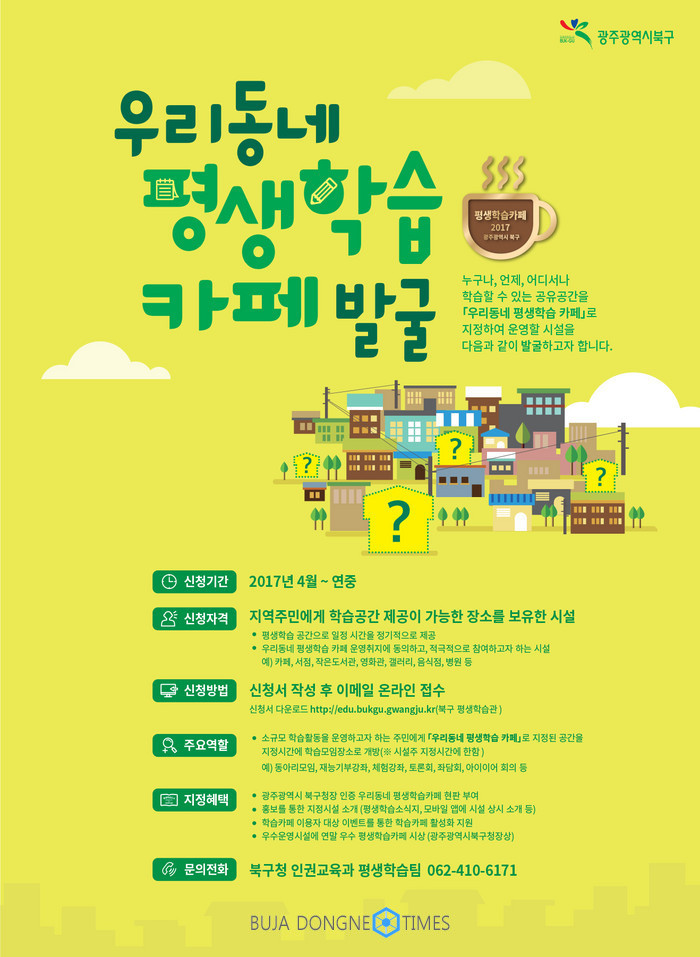 신청서 제출 후 현장방문 등을 거쳐 평생학습카페 15개소를 선정하고 북구청 인증 우리동네 학습카페 현판을 부여할 예정이며, 지역주민들은 조성된 학습공간에서 동아리모임, 재능기부 강좌, 토론회, 아이디어 회의 등을 시설주가 개방한 시간 내에 자체적으로 운영할 수 있다.