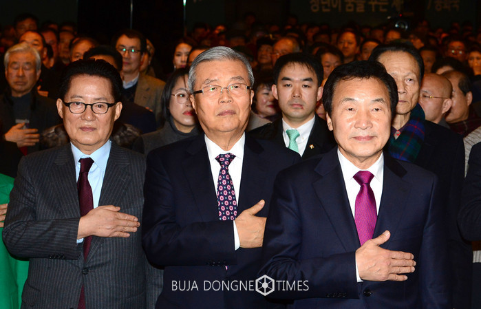 22일 오후 서울 종로구 세종문화회관에서 열린 '국민주권개혁회의' 출범식에 참석한 손학규(오른쪽부터) 전 민주당 대표와 더불어민주당 김종인 전 비상대책위원회 대표, 박지원 국민의당 대표가 국민의례를 하고 있다. 2017.01.22.