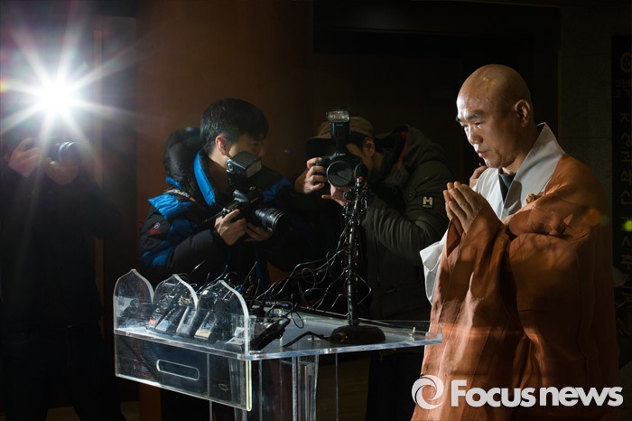(서울=포커스뉴스) 대한불교조계종 기획실장 겸 대변인인 일감 스님이 9일 오전 서울 종로구 조계사에서 한상균 민주노총 위원장 검거를 위한 경찰 공권력 투입과 관련, 조계종의 입장발표를 마친 뒤 합장하고 있다.