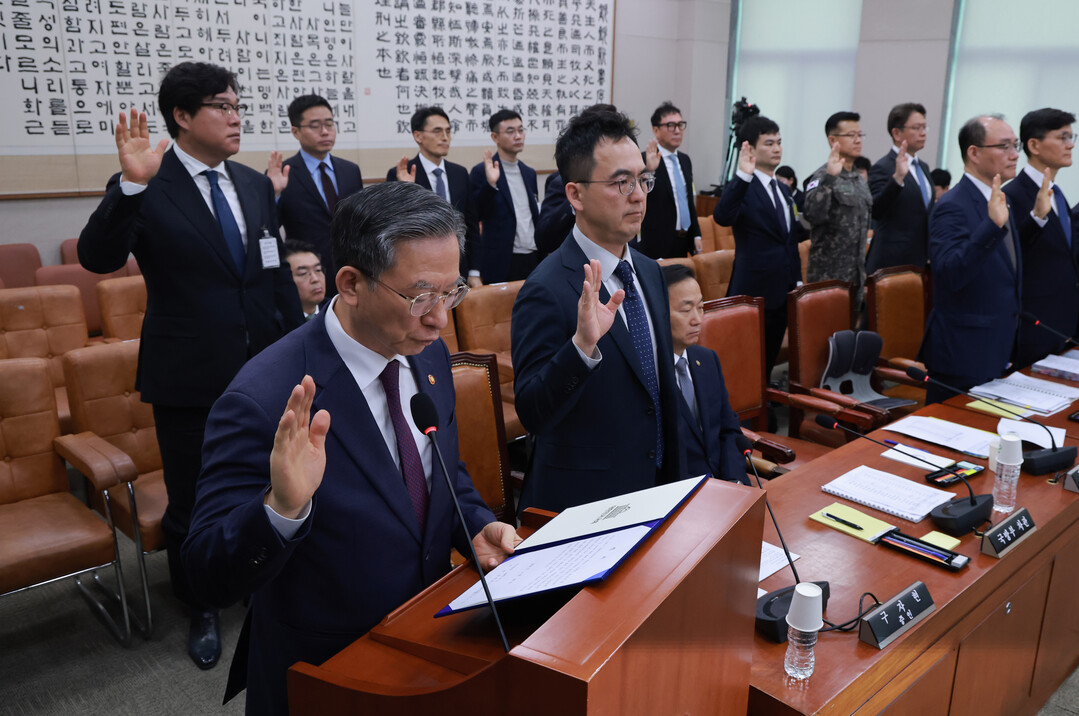 [부자동네타임즈 = 조영재 기자] 28일 국회 윤석열 정권 정치검찰 조작기소 의혹 사건 진상규명 국정조사특별위원회 제11차 전체회의에서 열린 종합 청문회에서 정성호 법무부 장관과 김성태 전 쌍방울 회장이 증인 선서를 하고 있다. 2026.4.28