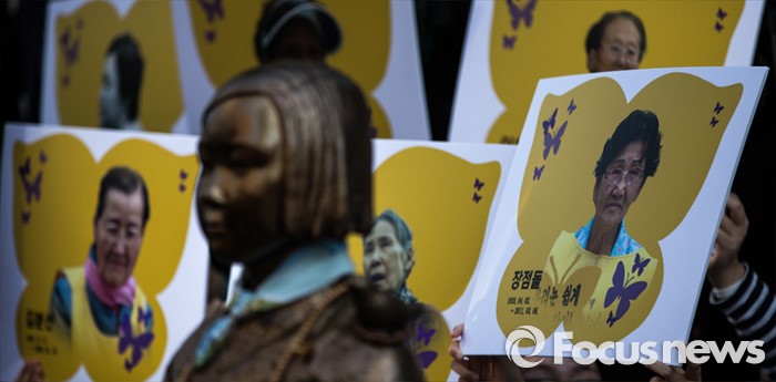 | △ 박근혜 대통령이 13일 아시아태평양지역 8개 뉴스통신사 인터뷰를 통해 "일본군 위안부 피해자 문제는 보편적 여성 인권의 문제"라며 "피해자분들이 생존해 계시는 동안 명예를 회복하고 상처를 치유할 수 있도록 아베 총리가 결단을 내려달라"고 촉구했다. 사진은 1200차 정기 수요시위 모습. <사진제공=포커스뉴스> |