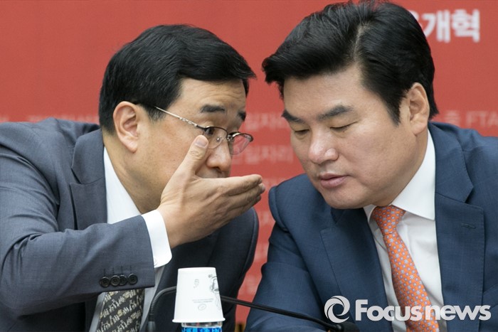 | △ 원유철(오른쪽) 새누리당 원내대표와 김정훈 정책위의장이 지난 10일 오전 서울 여의도 국회에서 열린 원내대책회의에 참석해 귀엣말을 하고 있다. <사진제공=포커스뉴스> |
