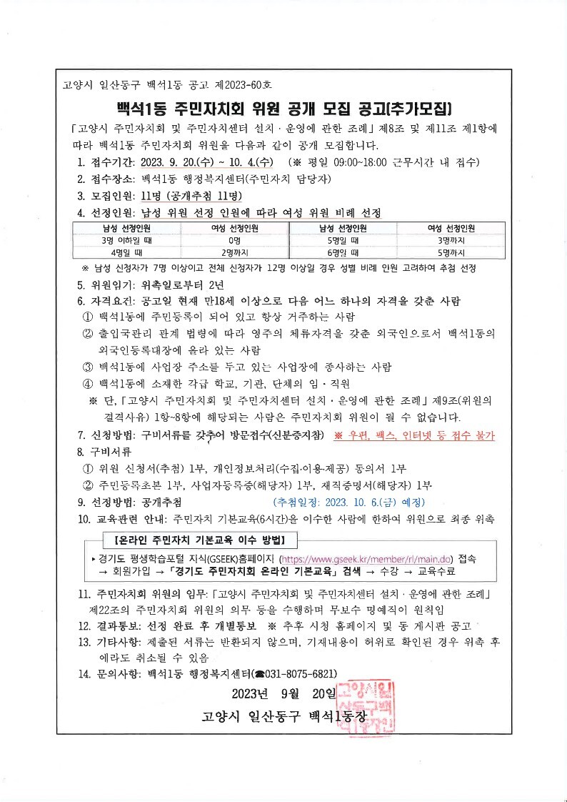 [부자동네타임즈 = 김인수 기자] 고양특례시 일산동구 백석1동은 오는 10월 4일까지 주민자치회 신규 위원을 추가 모집한다고 밝혔다.