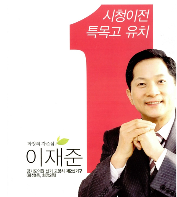 그런데 정작 이재준 후보는 지난 2006년 5월 제4회 지방선거에서 특목고 유치를 핵심 공약으로 내세웠다. 당시 고양시 제2선거구(화정1,2동) 에 출마하면서 선거공보 표지에 ‘시청 이전, 특목고 유치’를 커다랗게 배치한 것이다.