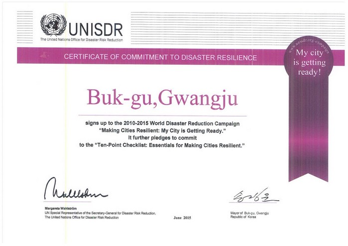 이에 광주 자치구 최초로 가립한 북구는 UN ISDR의 방재자문과 각종 메뉴얼, 자체안전 기법 등을 제고받고, 세계 도시들과 방재기술 및 정보를 공유할 수 있게 됐다.