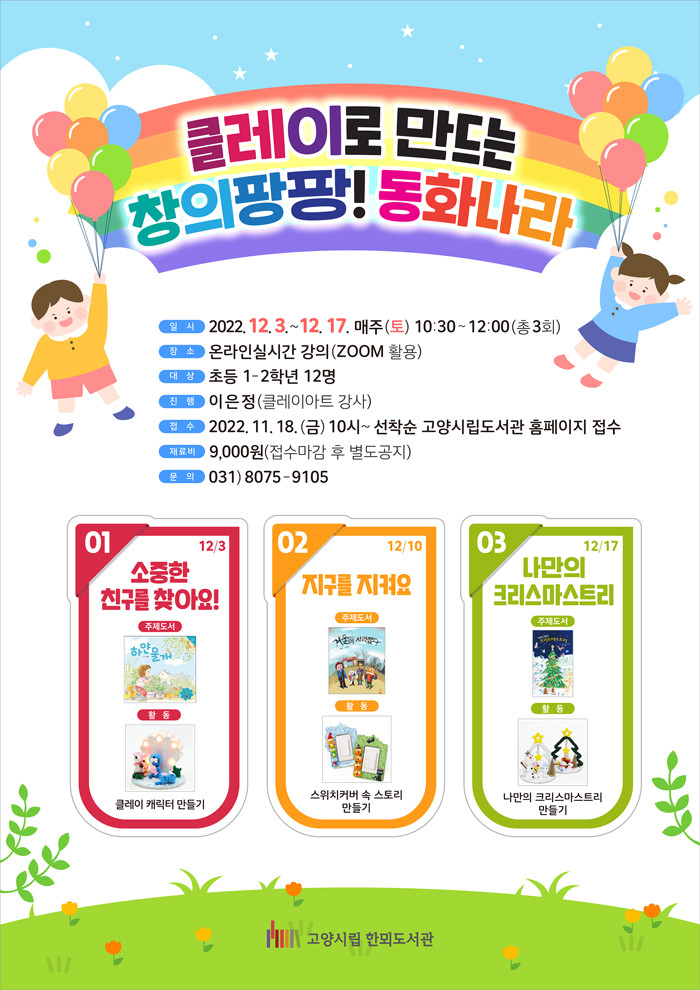 [부자동네타임즈 김인수기자] 고양특례시(시장 이동환) 한뫼도서관이 오는 12월 어린이들을 위해 클레이로 만드는 창의팡팡! 동화나라 프로그램을 온라인으로 운영한다.