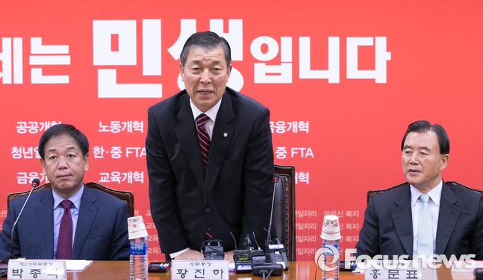 | △ 지난달 19일 오전 서울 여의도 새누리당사에서 열린 시도당위원장회의에 참석한 황진하(가운데) 사무총장이 인사하고 있다. <사진제공=포커스뉴스> |