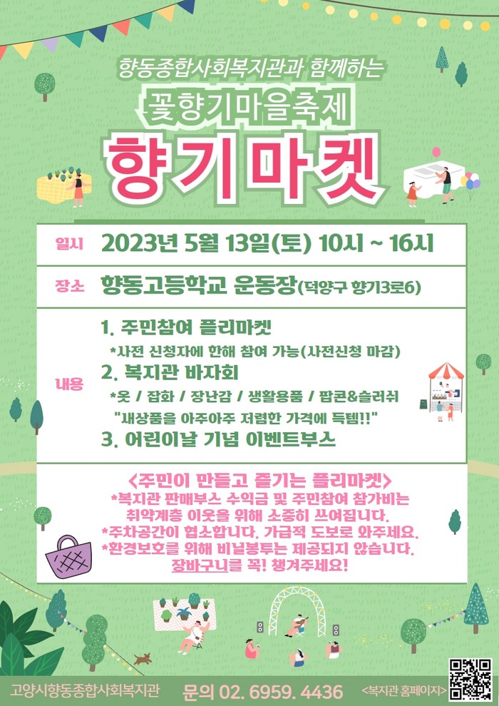 [부자동네타임즈 김인수기자] 5월 가정의 달을 맞이하여 고양시향동종합사회복지관(관장 양복선)이 고양시 향동고등학교에서 5월 13일(토)에 ‘꽃향기마을 축제’를 연다.