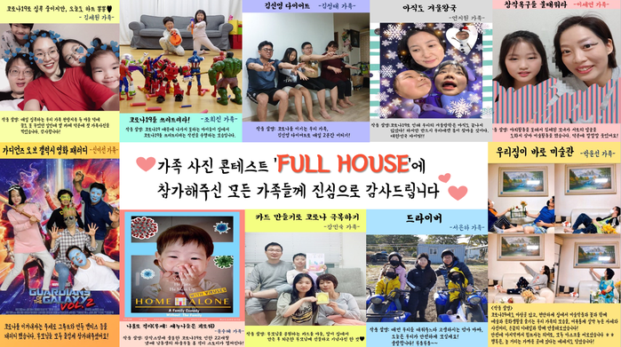 코로나19를 극복하는 가족의 일상을 담은 가족사진 콘테스트에는 전국적 재난 상황 속에서 자칫 우울할 수 있는 심신을 가볍게 해주는 익살스러운 가족사진들이 연출되어 눈길을 끈다. 출품작 중에는 ▲코로나19로 인해 평소보다 긴 겨울방학을 보내는 가족의 생활을 겨울왕국 영화 포스터로 패러디하거나 ▲코로나19 바이러스를 무찌르는 영웅이 등장하는 블록버스터 패러디도 있었다. 이른바 ‘집콕’ 생활 중에 가족 단위로 독특한 다이어트 운동을 하거나, 편안한 소파에 누워 예술작품을 감상하는 독특한 설정 컷도 눈에 띈다. 출품작 중 3편이 심사를 거쳐 우수작으로 선정되었는데, 우수작 선정 가족과 참여자 모두에게는 소정의 상품이 배송될 예정이다.