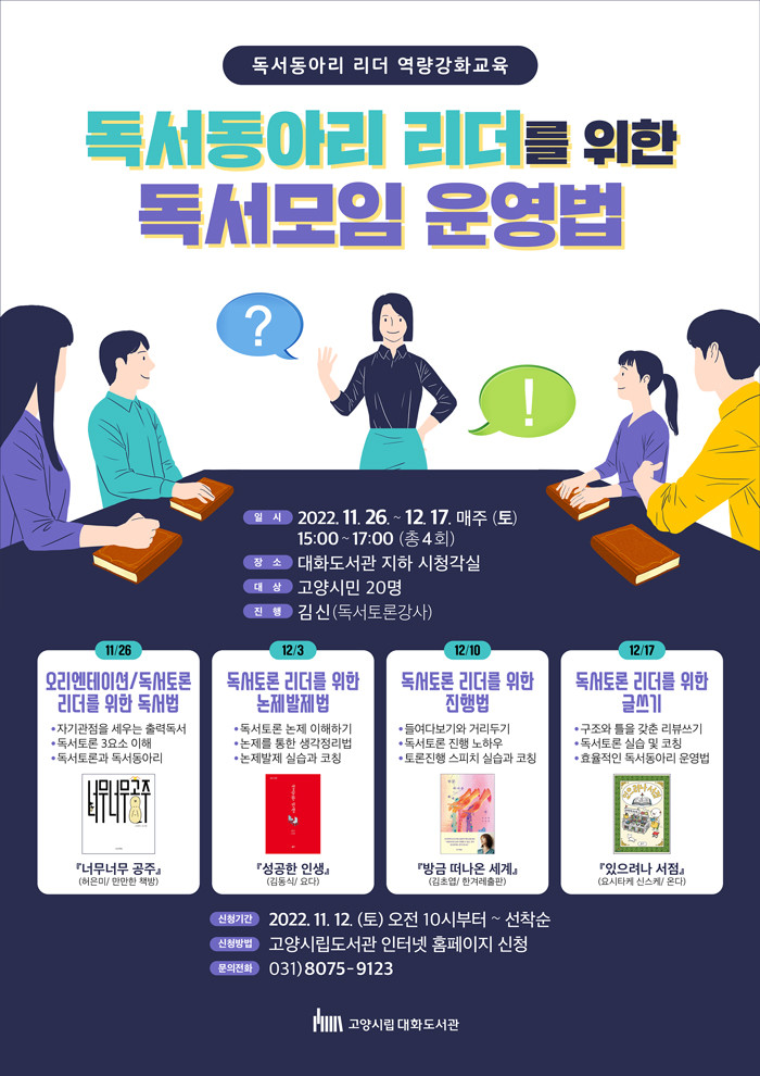 [부자동네타임즈 김인수기자] 고양특례시(시장 이동환) 대화도서관이 11월 26일부터 12월 17일까지 독서동아리 리더 양성 프로그램 독서동아리 리더를 위한 책모임 운영하는 법을 운영한다.