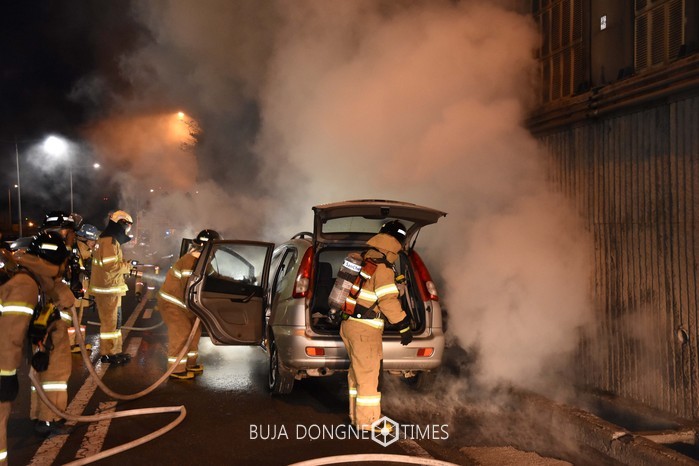 6일 오전 7시 2분께 서울 노원구 하계동 354-6 동부간선도로 월계1교~의정부방향에서 주행중이던 차량 엔진룸에서 원인 미상의 화재가 발생해 소방대원들이 화재 진압을 하고 있다. 2017.01.06. (사진=노원소방서 제공)