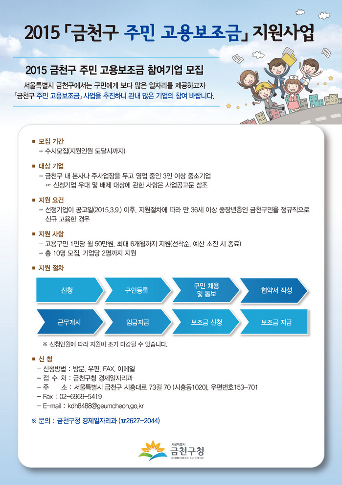 사업에 참여를 원하는 기업은 금천구청 경제일자리과로 방문 및 우편, 전자우편 등의 방법을 통해 신청이 가능하다.