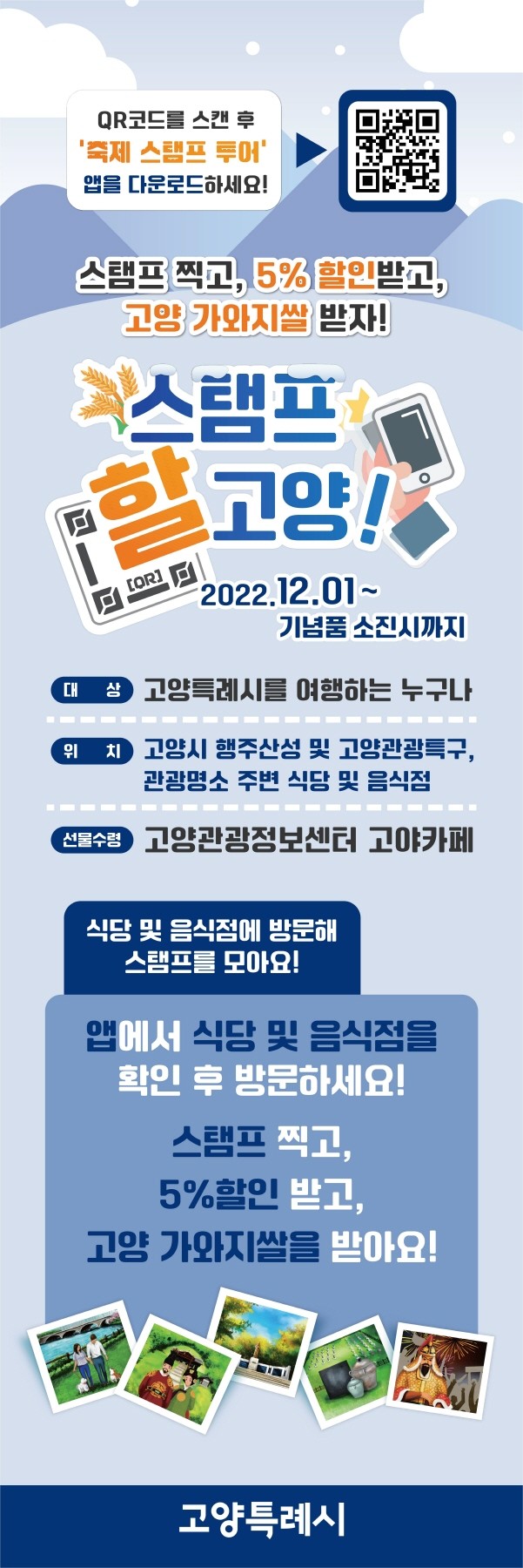 [부자동네타임즈 김인수기자] 고양특례시(시장 이동환)가 ‘스탬프할 고양’ 이벤트를 출시했다. 스탬프할 고양은 고양시 관광명소 주변 음식점과 카페를 연계한 스탬프투어 이벤트이다. 이벤트는 2023년 1월까지 한시적으로 추진될 예정이며 기념품이 소진되면 조기 마감될 수 있다.