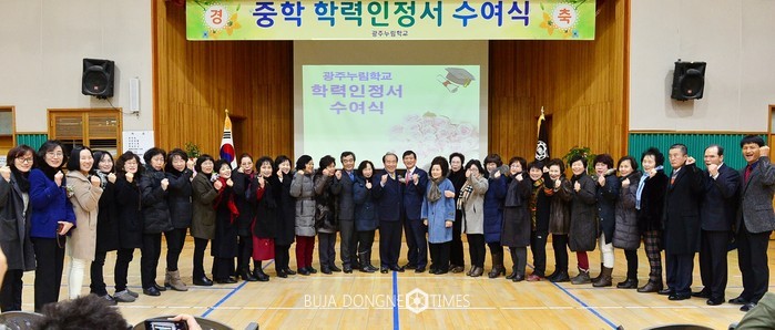 장휘국 광주시교육감은 3일(금) 오전 서구 치평중학교(교장 오근철) 강당에서 열린 성인문제교육(누림학교 과정) '2016학년도 중학교 학력인정서 수여식'에 참석, 졸업생 22명에게 학력인정서를 수여하고 존경의 마음을 담은 격려와 축하 인사를 했다.