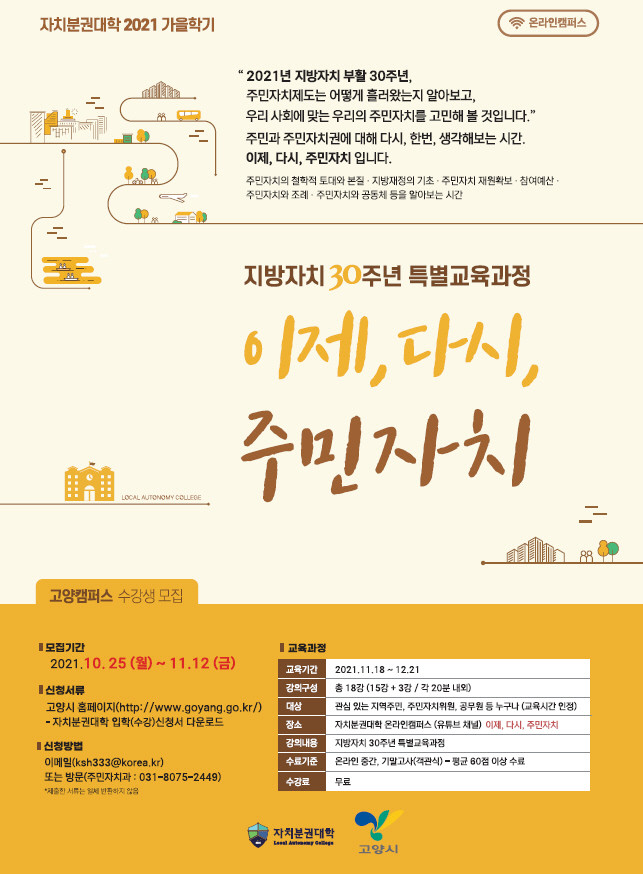 [부자동네타임즈 김인수기자] 고양시가 11월 12일까지 자치분권대학 고양캠퍼스 가을학기를 맞아 지방자치 30주년 특별교육과정‘이제, 다시, 주민자치’ 수강생을 모집한다.