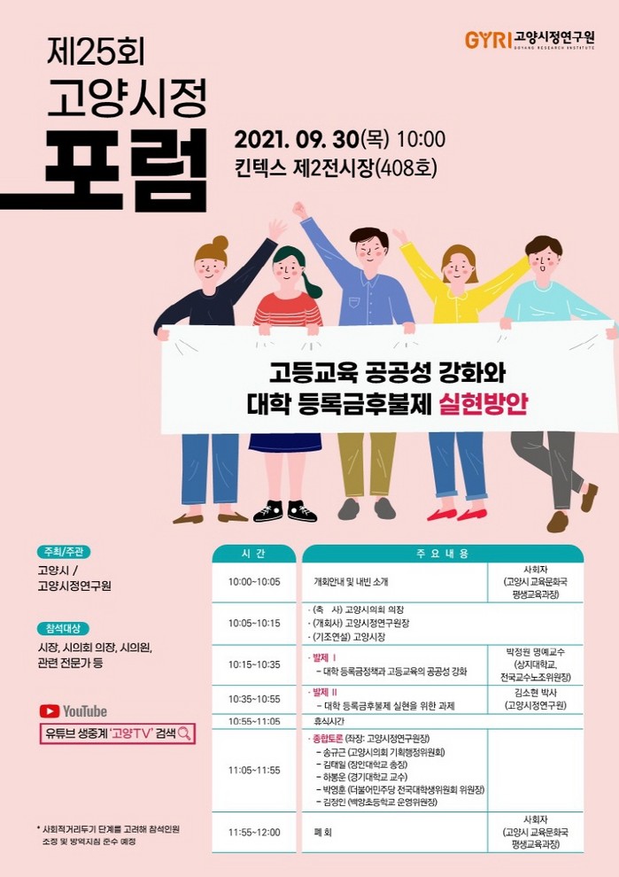이번 포럼은 고양시 유튜브 채널로 생중계 될 예정이다. 방역 수칙에 따라 현장 참여는 30명 이내로 제한된다. 온라인 참여는 유튜브에서 ‘고양TV’를 검색한 후 접속하면 된다. 현장 참여를 원할 경우 고양시 평생교육과로 29일까지 선착순으로 접수하면 된다.