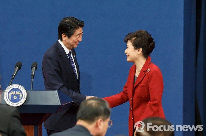 | △ 박근혜 대통령과 아베 신조(安倍晋三) 일본 총리는 2일 청와대에서 정상회담을 가졌다. 사진은 1일 한일중 정상회의 후 공동기자회견을 마친 뒤 악수하는 두 정상 모습. <사진제공=청와대> |