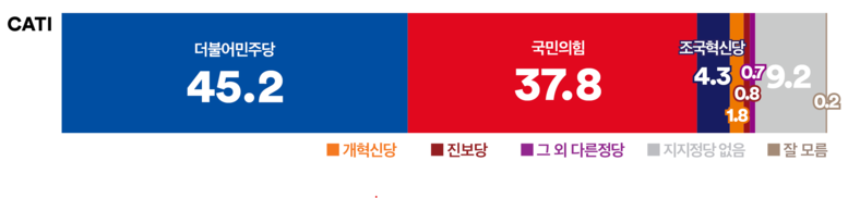 [부자동네타임즈 = 이병도 기자] ‘여론조사꽃’이 2025년 1월 23일부터 25일까지 사흘간 실시한 전화면접조사에서 ‘더불어민주당’의 지지율은 45.2%로 집계됐다. 이에 비해 ‘국민의힘’은 37.8%를 기록하며, 양당 간 격차는 7.4%p로 나타났다. 특히 ‘더불어민주당’과 ‘조국혁신당’의 합산 지지율(49.5%)은 ‘국민의힘’을 11.7%p 앞서는 결과를 보였다.