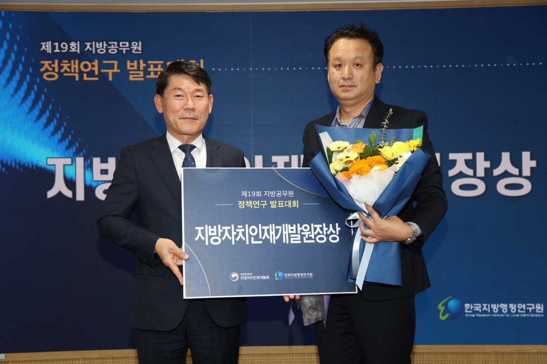 [부자동네타임즈 = 김인수 기자] 도로건설사업소 김진설 주무관이 11월 1일 자치인재원에서 개최된 ‘2023 지방공무원 정책연구 발표대회’에서 ‘자가용 환가가치 차령초과 자진말소 제도를 이용한 징수율 제고 정책 사례연구’로 지방자치인재개발원장상을 수상했다.