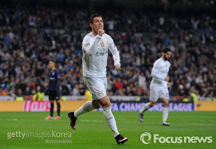 | △ <마드리드/스페인=게티/포커스뉴스> 레알 마드리드 공격수 크리스티아누 호날두가 9일 새벽(한국시간) 홈에서 열린 말뫼와의 조별라운드 6차전 경기에서 득점을 올린 뒤 환호하고 있다. (C)게티이미지/멀티비츠 |