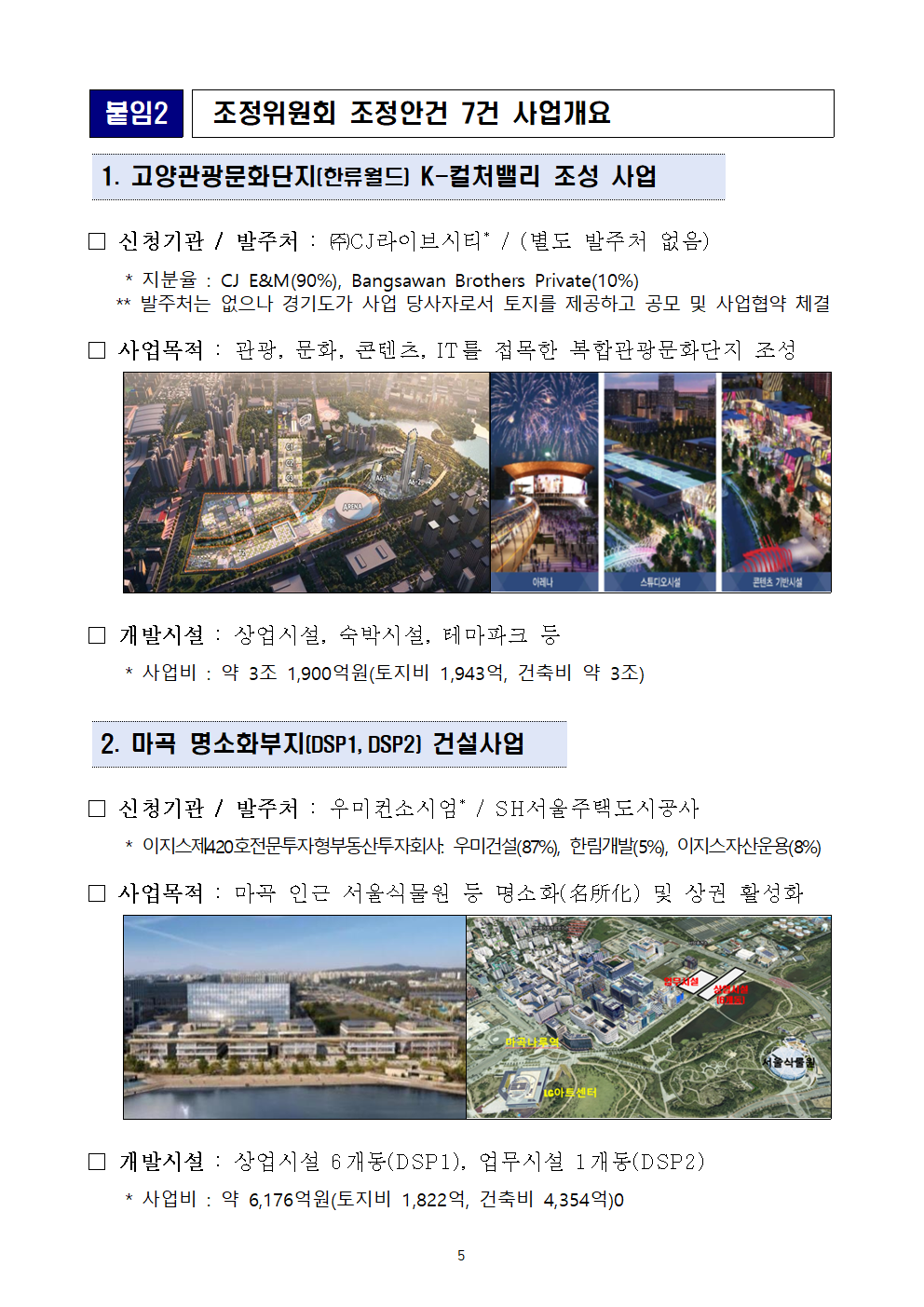 고양시에서 진행되고 있는 CJ라이브시티 조성사업은 지난 2021년 10월에 비전선포식을 갖고 6만명 규모 관객 수용이 가능한 초대형 음악공연장인 CJ아레나 착공에 들어갔다. 그러나 최근 건설비 급증 등의 문제로 지난 4월 공사가 잠정 중단됐다. 본 사업은 경기도 소유의 토지에 CJ라이브시티가 건설을 진행하는 민관합동 사업이고, 중단된 공사 재개를 위해서는 양측 간 계약조건 등에 대한 합의가 필수적이다.