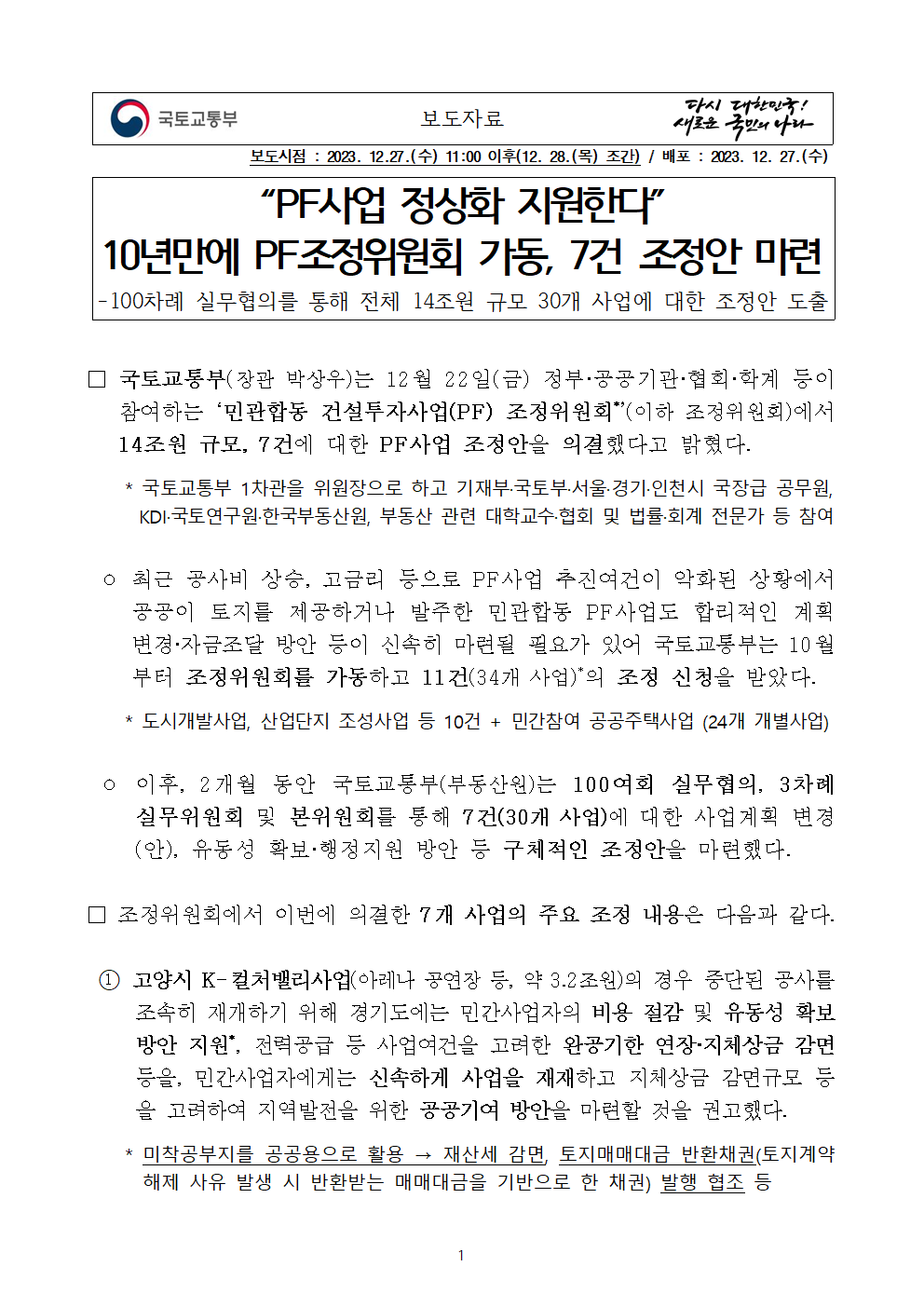 [사진설명] 국토부 보도자료 - “PF사업 정상화 지원한다” 10년만에 PF조정위원회 가동, 7건 조정안 마련.